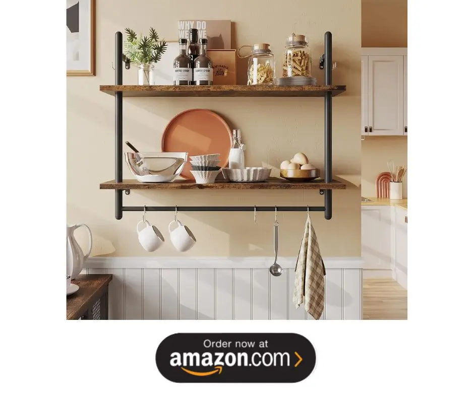 A compact shelf with hooks for mugs and jars. Saves space while adding charm to kitchens or apartments.