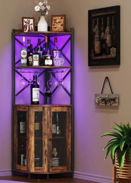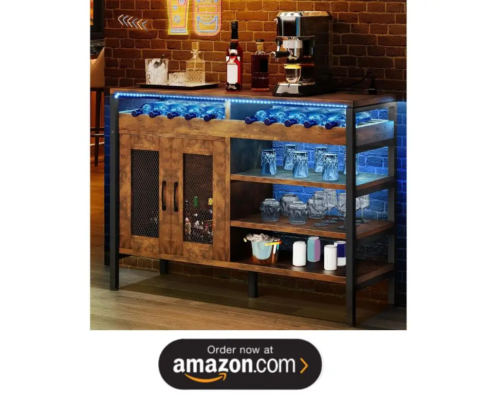 Blends metal and wood for an industrial look. Includes shelves and wine storage, making it versatile and stylish.