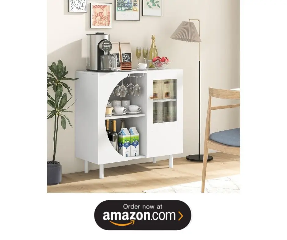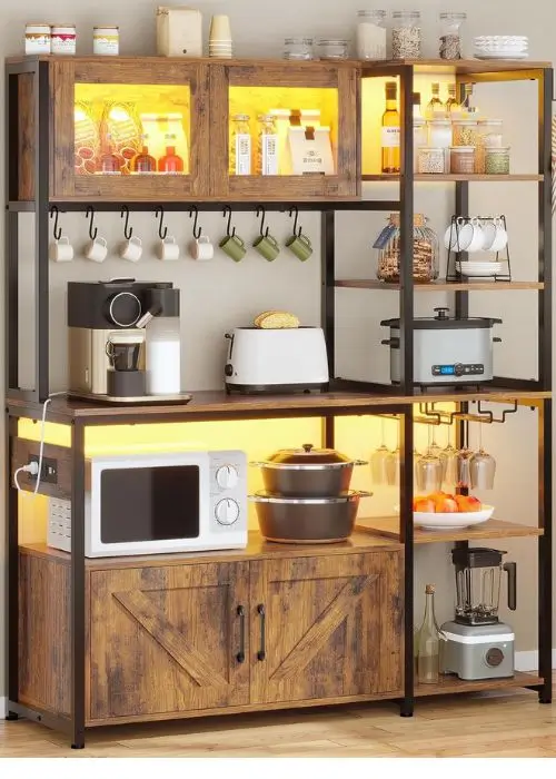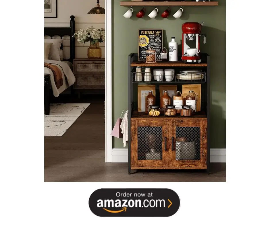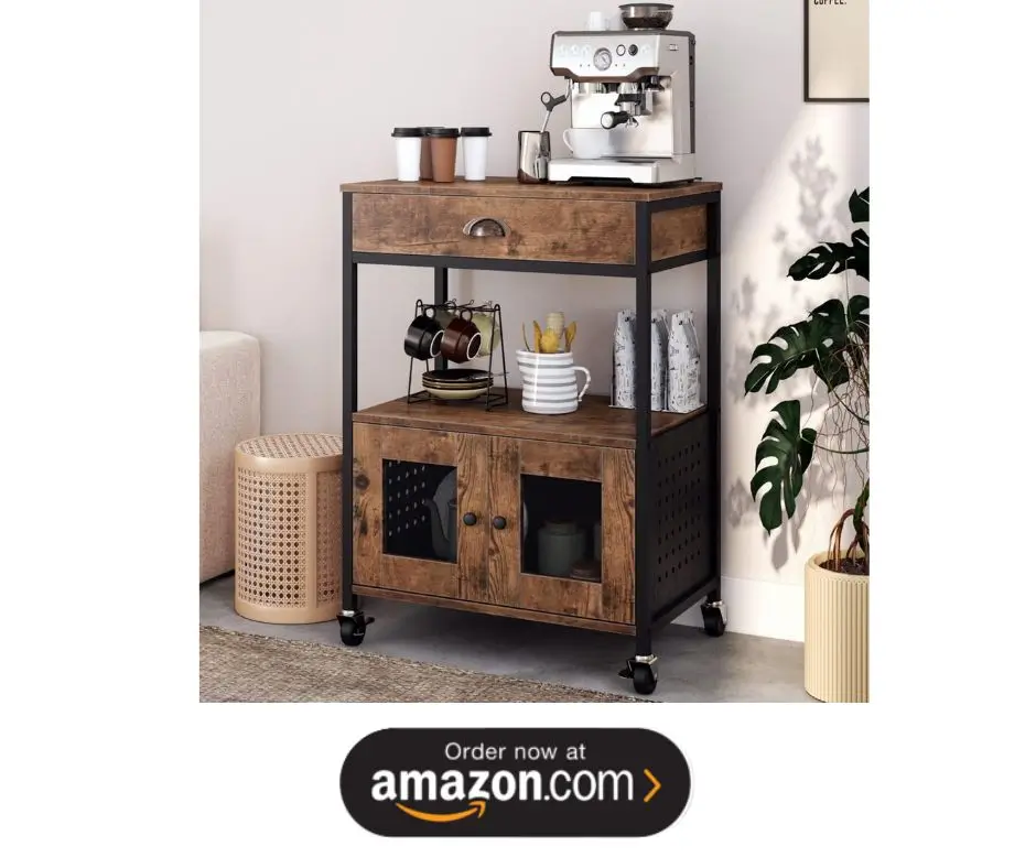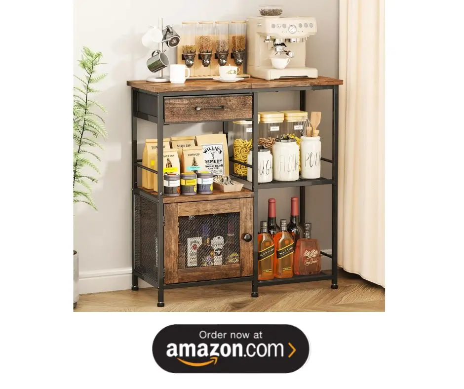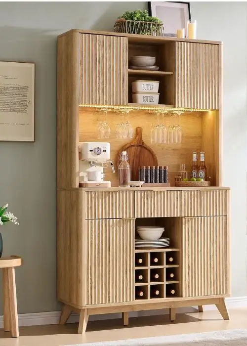 A tall hutch provides vertical storage, combining open shelves with cabinets. It’s excellent for storing larger machines, mugs, and decorative pieces. With its height, it makes a strong visual statement and works well in dining areas or large kitchens. A hutch is ideal for those needing both storage and display options. For homeowners who prefer a grand and organized coffee setup, this is an outstanding choice.