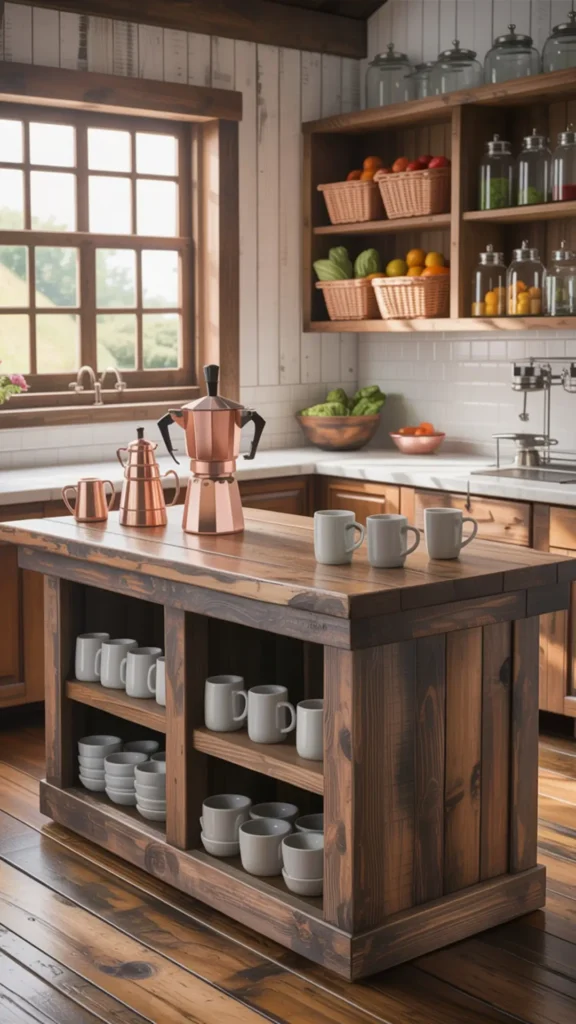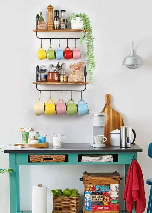 A floating shelf coffee bar is sleek, stylish, and space-efficient. It uses vertical wall space, featuring one or more shelves to hold coffee jars, mugs, and décor. This design works especially well in compact kitchens or office corners. Easy to install, it can also be paired with hooks underneath for added functionality. For those who love minimalist décor and want to save space, a floating shelf coffee bar is a practical and chic solution.