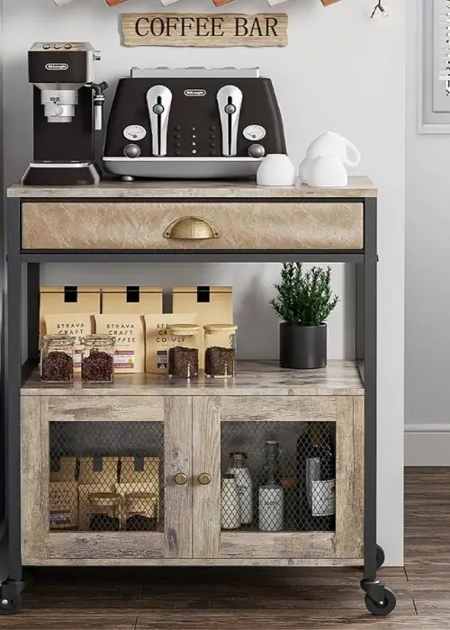 An industrial coffee stand is bold and trendy, featuring black steel frames with wooden accents. It suits modern, loft, or urban-inspired interiors beautifully. With multiple tiers and robust construction, it provides plenty of room for machines, jars, and extras. Its sturdy build ensures long-lasting use, while the industrial design adds character to your space. If you want a coffee bar home that doubles as a statement piece, this type is an excellent choice.