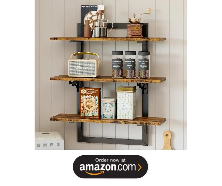 If you’re working with limited space, a simple wall-mounted coffee shelf can do wonders. All you need is a sturdy shelf to hold your essentials and hooks for mugs. This idea makes use of vertical space and keeps everything within reach. It’s perfect for apartments, dorm rooms, or compact kitchens where every inch matters.