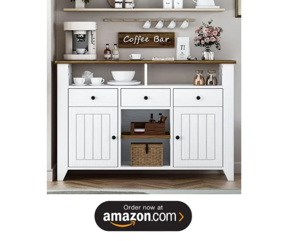 For practicality, consider a coffee nook with a storage cabinet. A buffet or sideboard keeps mugs, syrups, and accessories hidden while offering a polished look. You’ll enjoy plenty of countertop space for your machine and décor while keeping clutter out of sight.