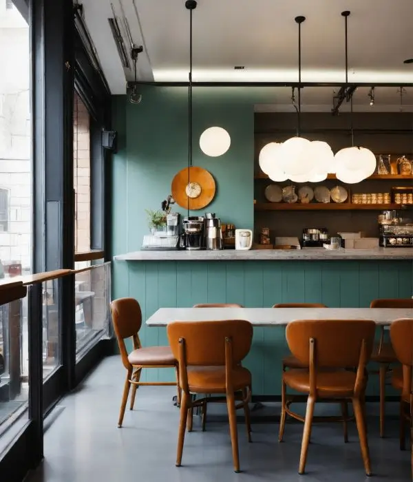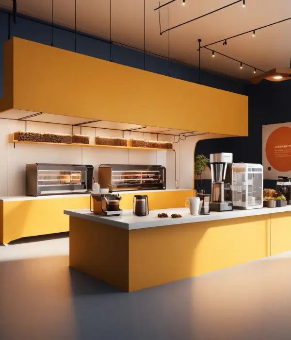 An open-concept coffee nook blends seamlessly into kitchens or living areas. Use counters or shelving to define the space without walls, creating an inviting, social environment.