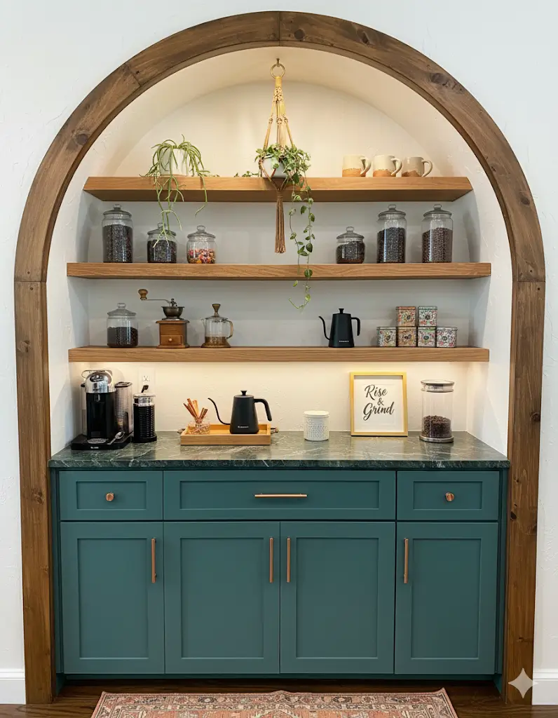 Add soft colors, metallic hardware, or pastel cabinetry—perfect for a chic, feminine coffee zone.
