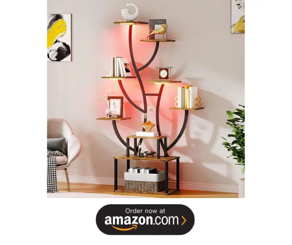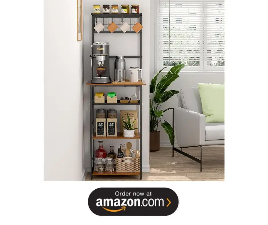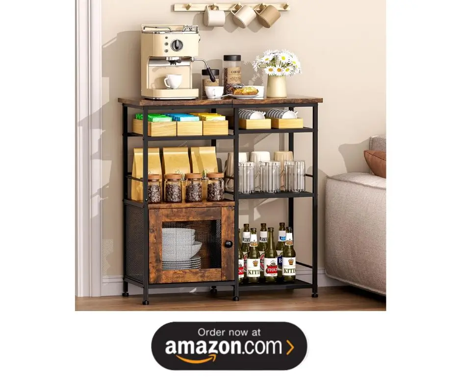 Organizes mugs, syrups, and decor while neatly framing the bar.