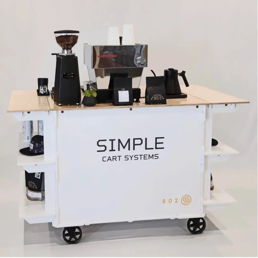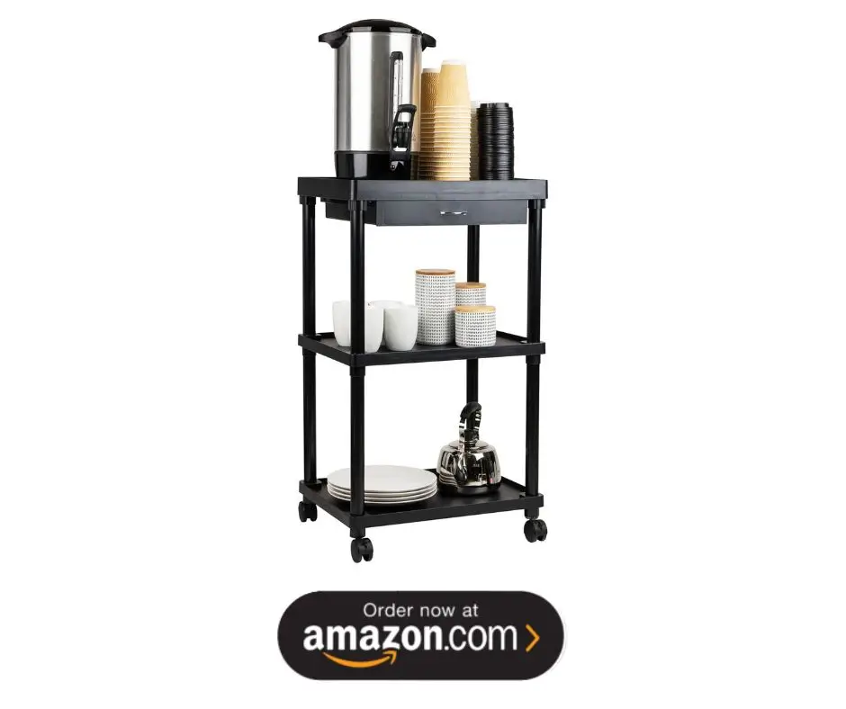 A trendy rolling cart ideal for coffee setups in compact spaces.