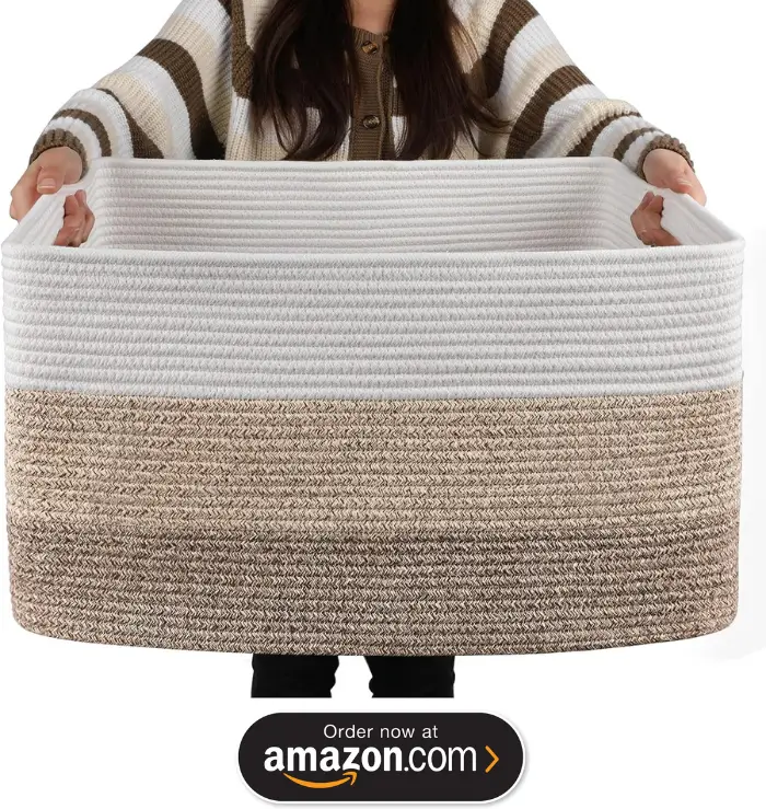 This type of basket is roomy and lightweight, making it simple to move around and clean under. It keeps your blankets tidy without hiding them completely, making it a stylish and functional storage choice.