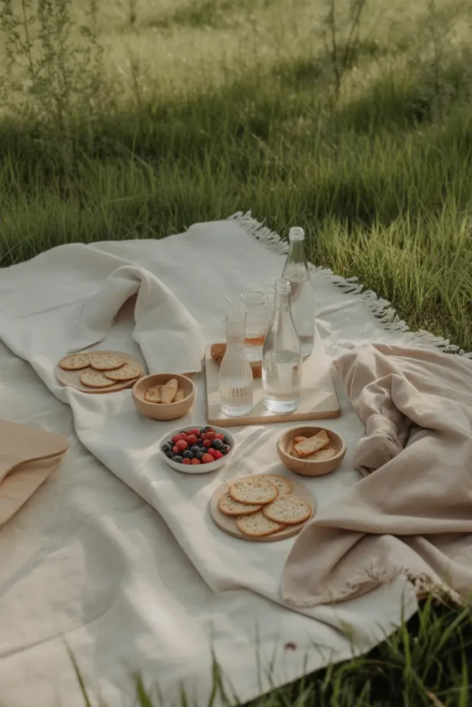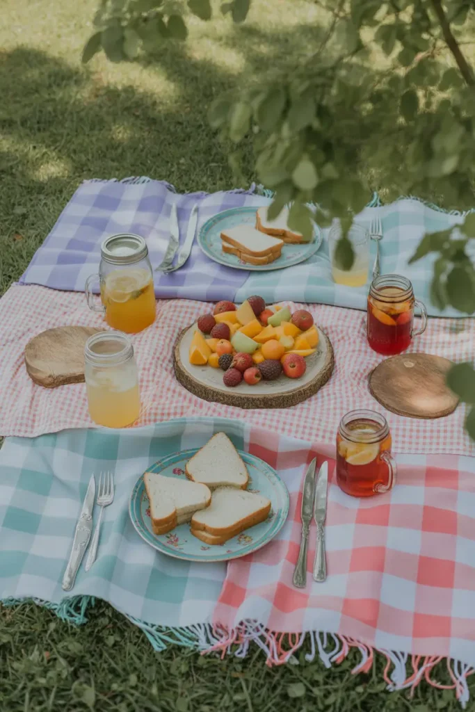 Soft, layered blankets instantly make any picnic feel welcoming and relaxed. Choose different textures and gentle colors to create warmth without extra effort. Scatter cushions or shawls so guests can sit comfortably for hours. This setup encourages people to slow down, stretch out, and enjoy conversations naturally. Adding small baskets or wooden trays keeps snacks organized while still feeling casual. Cozy seating invites longer stays, turning a short outing into a peaceful afternoon filled with laughter and shared stories.