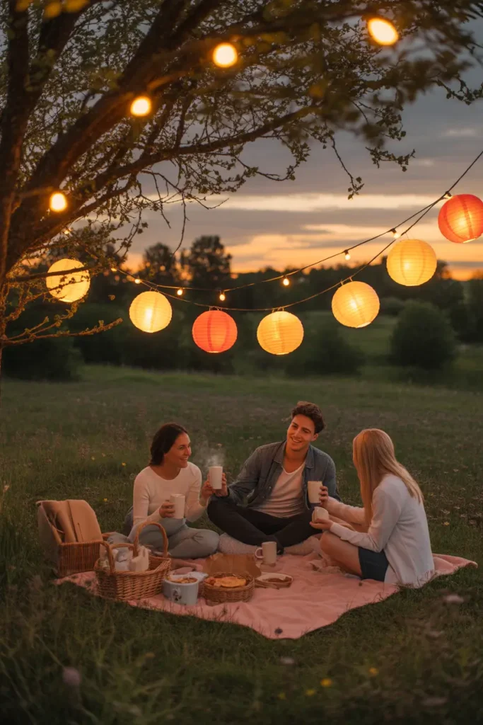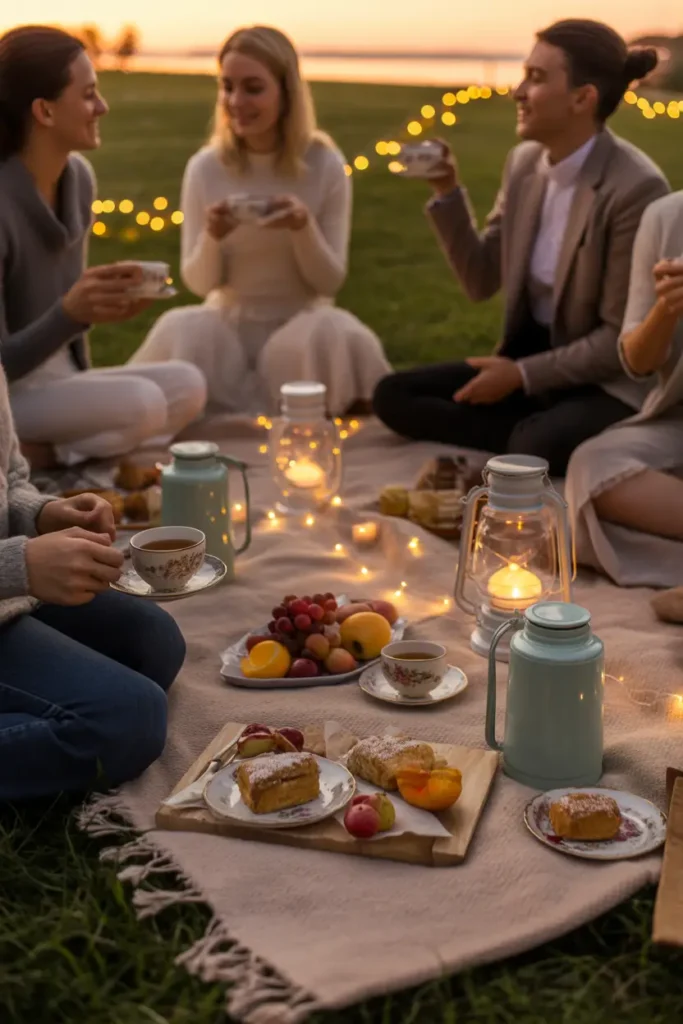 Late afternoon picnics with tea create a calm and comforting mood. Pack thermoses filled with warm tea, light pastries, and fresh fruit for a gentle experience. Soft lighting from candles or lanterns adds charm as daylight fades. Watching the sunset together naturally slows conversations and brings peaceful energy. This idea works beautifully for small gatherings where connection matters more than activity, helping everyone end the day feeling refreshed and emotionally recharged.