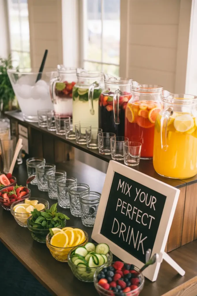 Set up a small drink corner with juices, lemonade, or flavored water. Guests enjoy mixing their own drinks, adding fun interaction without complicated planning. Fresh fruits and herbs add color and freshness to the setup. Interactive elements make gatherings feel thoughtful while still easy to manage. Everyone appreciates having choices, and the drink station becomes a natural gathering spot for conversation.