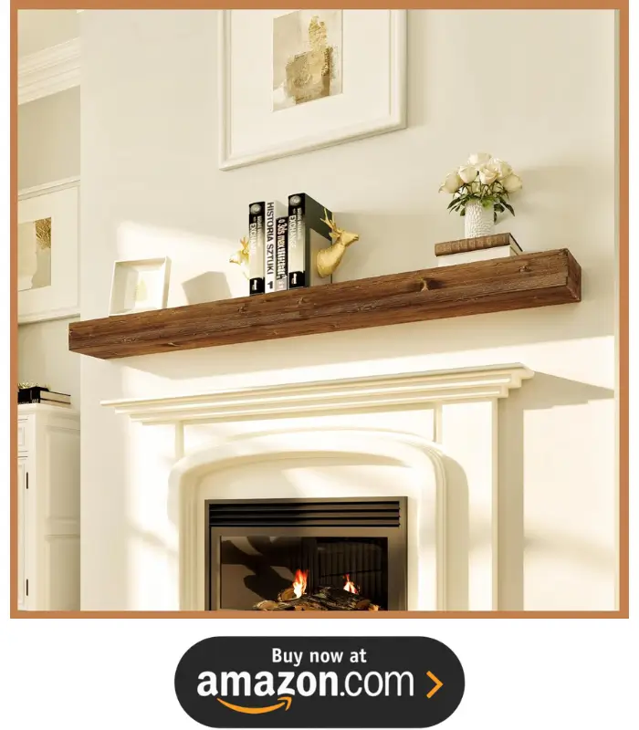 Crafted from reclaimed wood, this floating mantel adds natural warmth above your electric fireplace. Pre-finished and easy to mount, it pairs beautifully with modern and farmhouse décor. Available from Home Depot or Etsy.