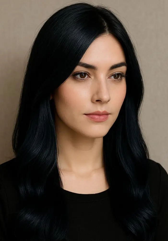 Blue-black is dramatic, glossy, and modern. The cool blue undertone makes it perfect for cold skin tones. It provides contrast while staying harmonious.