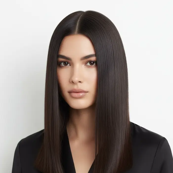 Straight hair with blunt ends is perfect for minimal styling. It emphasizes structure and health. Gloss sprays complete the polished, sophisticated finish.