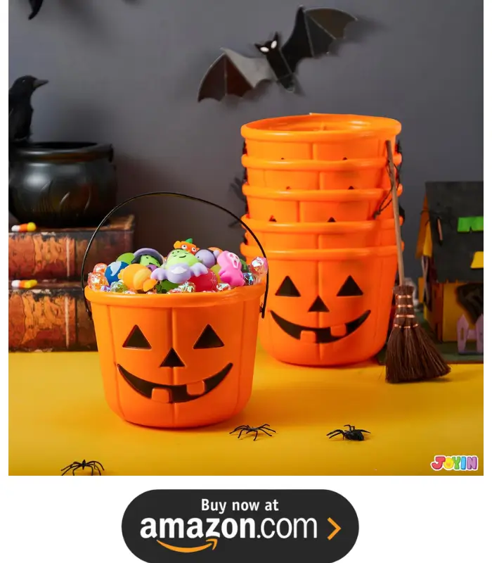 Plastic or metal Halloween buckets with cute designs make the perfect base. Choose pumpkins, ghosts, or simple black styles for flexibility. They’re reusable for décor or trick-or-treating later.