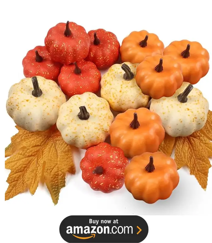 Center your display with a line of pumpkins in varying sizes — mix white, orange, and green hues for depth. Add dried leaves, wheat stalks, or acorns for that authentic autumn touch. Soft amber candles complete the look. This theme radiates warmth, comfort, and togetherness — ideal for family dinners or cozy gatherings that embrace fall’s natural beauty.