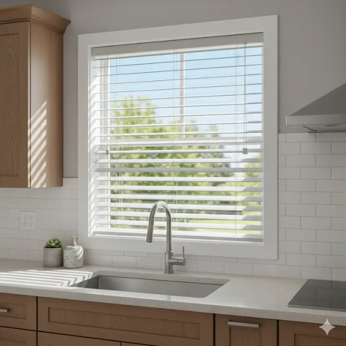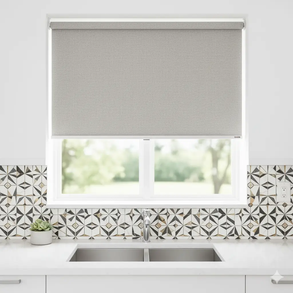 Moisture-resistant roller shades are perfect for kitchens, offering light control with a modern, minimalist look.