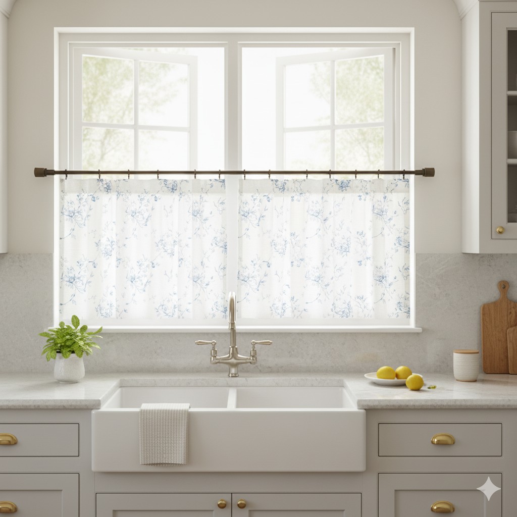 Café curtains cover only the lower half of the window, offering privacy while letting natural light flood the room. They’re perfect for kitchens where you want brightness without feeling exposed. They are often styled with lightweight cotton or linen fabrics and add a cozy, farmhouse-inspired charm. Café curtains are budget-friendly, easy to maintain, and ideal for smaller kitchens looking for warmth and character.
