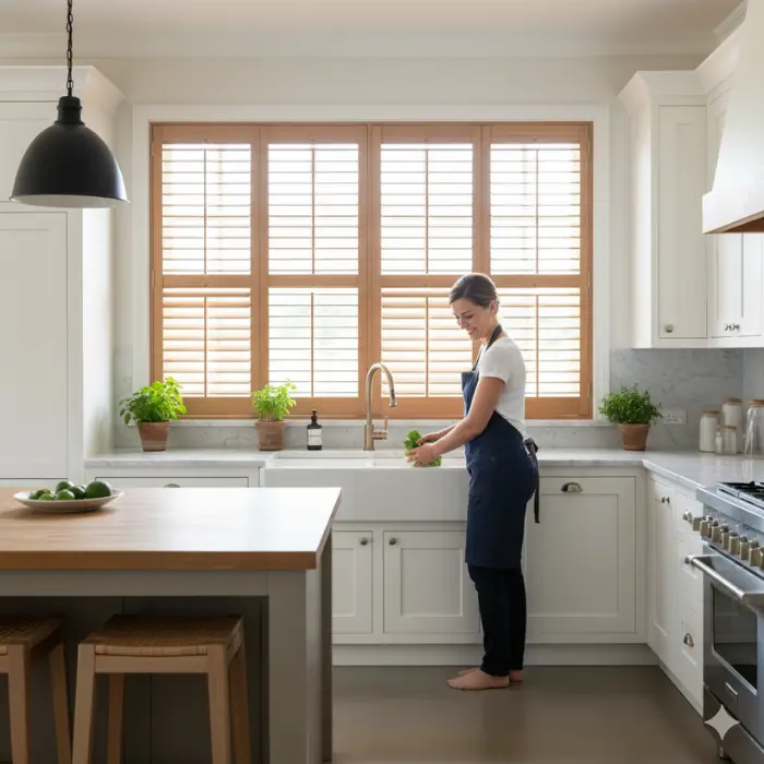 Wooden or faux-wood shutters offer a timeless, durable solution for kitchen windows. They’re resistant to heat and moisture, making them especially suitable near sinks. Adjustable louvers allow you to control light and privacy easily. Shutters complement various styles, from traditional to coastal, and add a polished, built-in look to the kitchen. While a larger investment upfront, shutters are long-lasting and add value to your home.