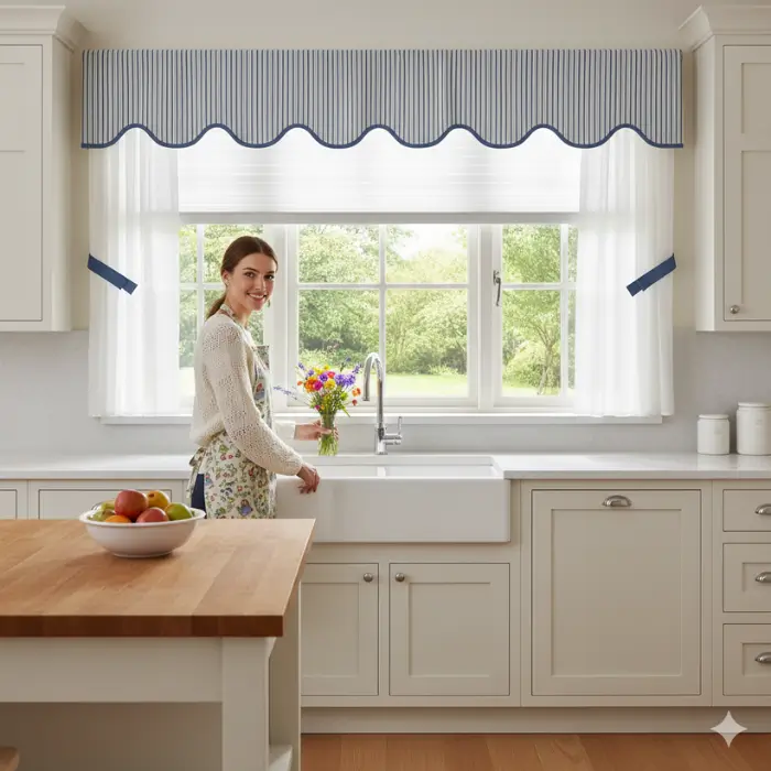 Sheer curtains are lightweight, airy, and perfect for kitchens where natural light is a priority. They soften harsh sunlight without blocking the view and add a delicate, elegant touch. Sheers work well when layered with blinds or shades for extra privacy. Easy to wash and maintain, they are a practical option for busy households. Their flowing fabric instantly makes the kitchen feel fresh and inviting.