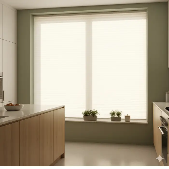 Also known as honeycomb shades, cellular shades are energy-efficient window treatments that help regulate temperature in the kitchen. Their unique design traps air in pockets, providing insulation against heat and cold. They’re available in light-filtering or blackout options, offering flexibility depending on your needs. Cellular shades are sleek, modern, and perfect for eco-conscious homeowners.
