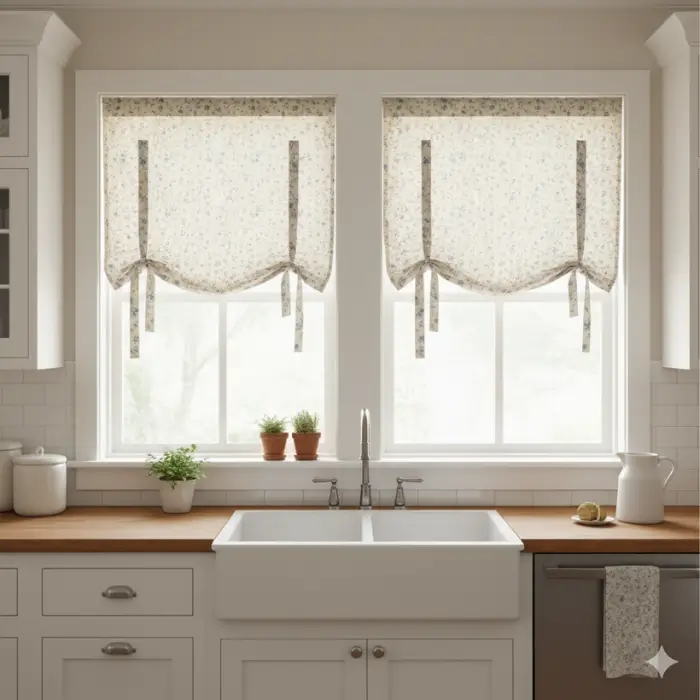 Tie-up shades are casual and charming, ideal for adding softness to a kitchen space. They consist of fabric panels tied up with ribbons or straps, which can be adjusted for light and privacy. They’re often made from cotton or linen and come in various prints. Tie-up shades add personality, warmth, and a slightly vintage appeal, making them a fun and stylish option.