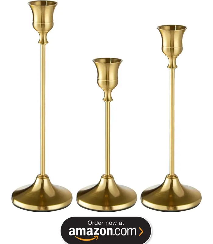 A trio of brass taper candle holders provides understated elegance; their antique gold finish harmonises beautifully with warm lighting and vintage touches. Positioned across a dining table or mantel, they introduce metallic warmth, which is a key element in the Ralph Lauren style—metallics used with restraint, in service of ambience, not show. Pair them with cream candles and runtime candles for that soft glow aesthetic.