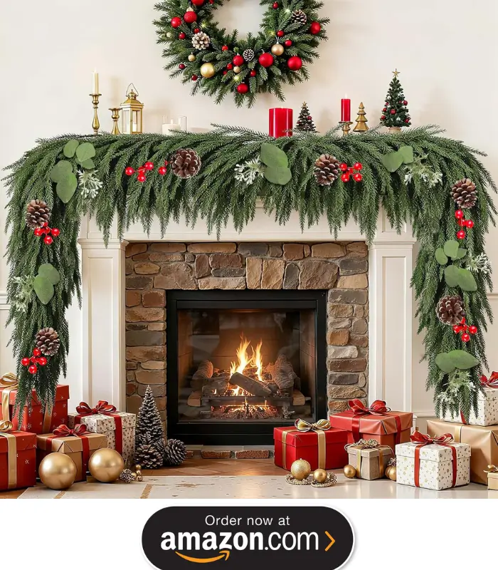 Lifelike garland of faux pine with red berry sprigs and pinecones offers seasonal greenery without the maintenance of fresh greenery. Drape it along a mantel, staircase handrail, or console table for a natural, relaxed feel that still reads as polished. Greenery is a significant anchor in the Ralph Lauren style—bringing nature inside but with a curated, elegant presentation.
