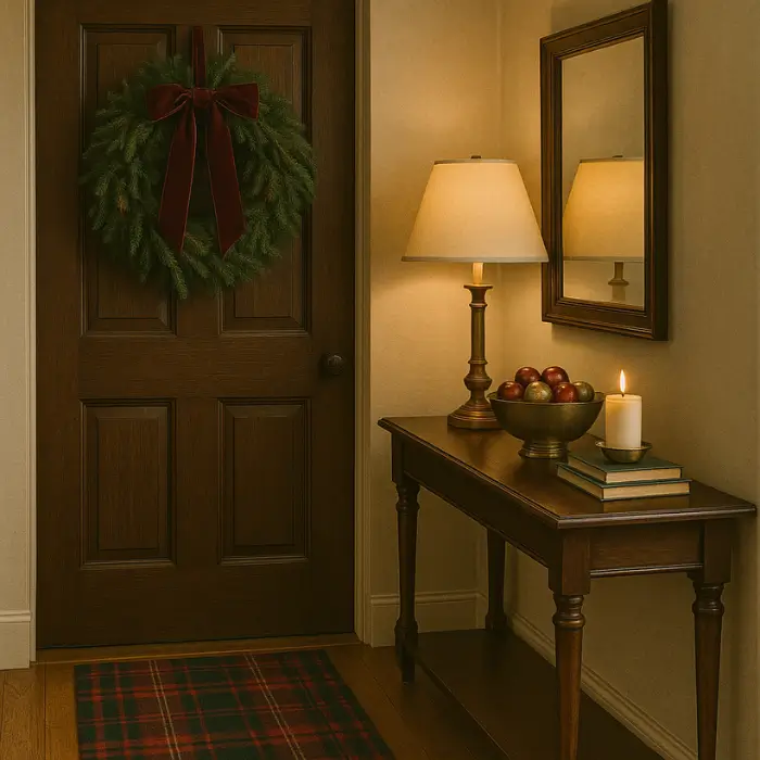 The entryway introduces the story of your home. Begin at the door with an evergreen wreath tied in a velvet or tartan ribbon. Inside, layer textures: a wool or plaid runner underfoot, a console table with a brass lamp, a bowl of ornaments, and a few stacked books. Each element should feel curated but natural.