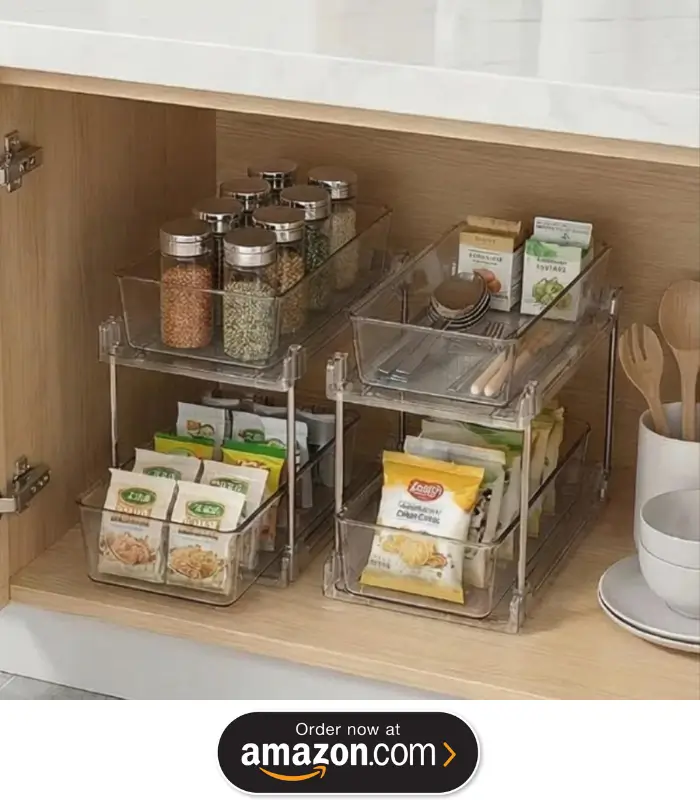 Vertical organizers use height to your advantage when shelf space is scarce. Slim bins or shelves fit into narrow areas that usually go unused. This expands capacity without crowding your pantry.