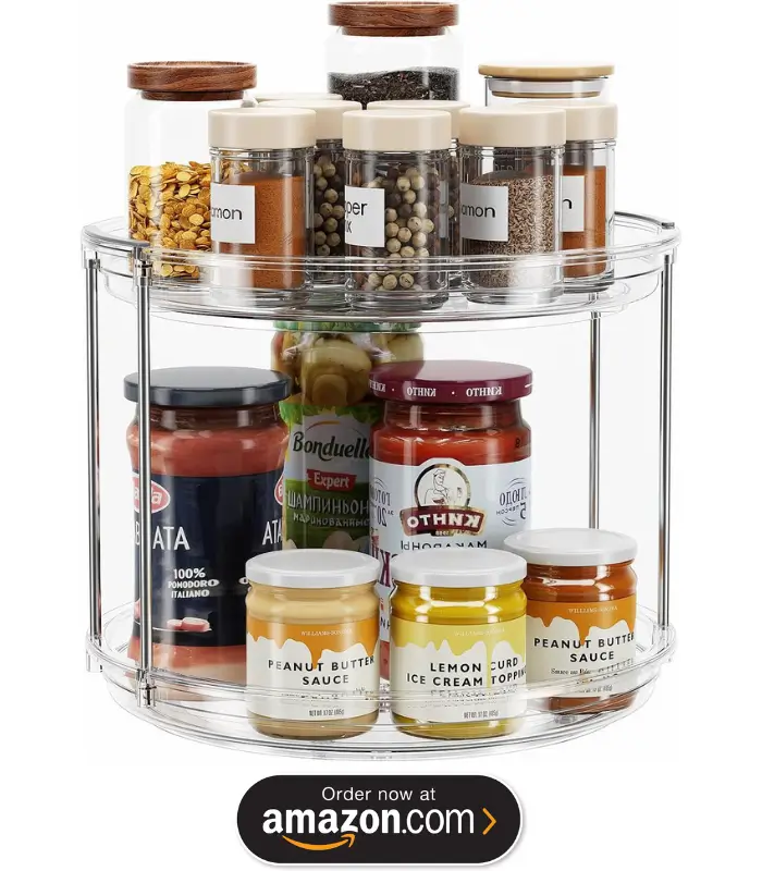 A two-tier Lazy Susan brings hidden pantry items into easy reach with a simple spin. The raised edges keep spices, jars, and bottles stable during rotation. It saves time and reduces clutter.