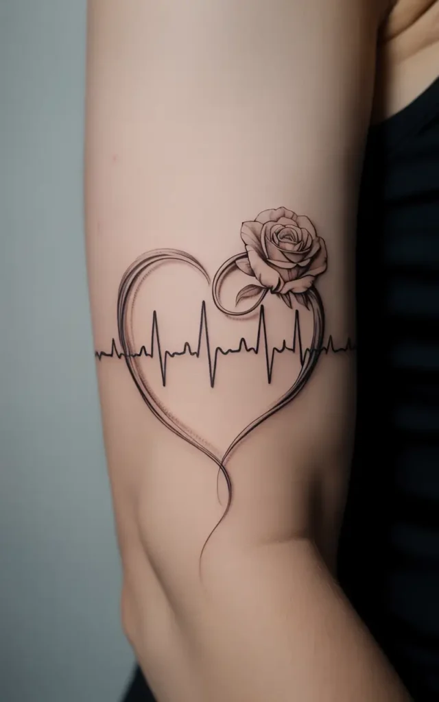 A heartbeat tattoo, often designed as an electrocardiogram (EKG) line, symbolizes life, vitality, and passion. Some people personalize it by incorporating loved ones’ initials, dates, or symbols. It’s a meaningful way to commemorate survival after a health struggle or to honor someone dear.
