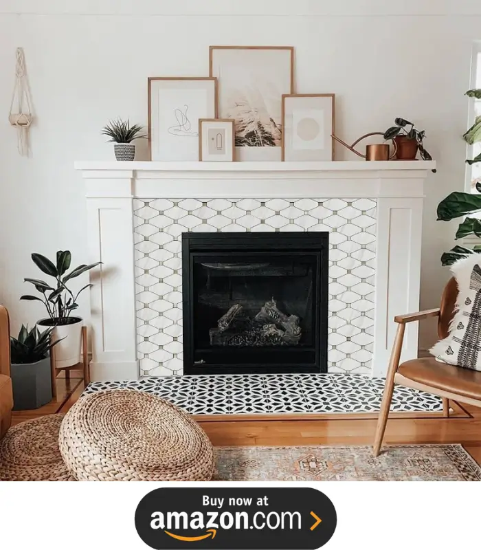 These handcrafted ceramic tiles bring vibrant charm and artistic flair. Perfect for eclectic or cottage-style fireplaces. Available from Fireclay Tile or Amazon.