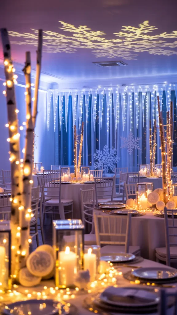 Use different light sources so the room feels layered. Hang icicle curtain lights behind the backdrop, wrap fairy lights around branches, and place LED candles on tables. Add lanterns and glass candle cylinders to create small areas of glow. If you have uplighting, use soft icy-blue lights in corners to give the walls a winter tone. Keep lighting soft, not too bright, so the décor stays elegant instead of harsh.