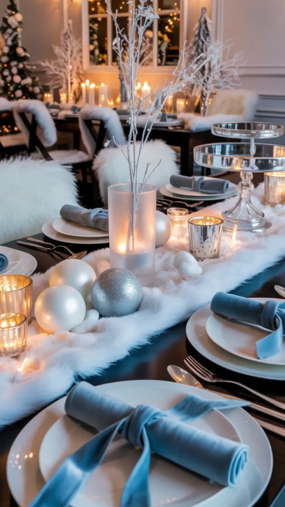 Faux fur adds cozy-luxe style right away. A white faux fur runner, chair covers, or a faux fur throw on a lounge chair makes the whole space feel soft and elegant. Velvet is another winter-friendly texture that looks very high-end, especially in ice blue, deep navy, silver-gray, or white. Use velvet ribbon on napkins, chairs, or wrapped around vases and candleholders. Even one small velvet detail can make your décor look more thoughtful.
