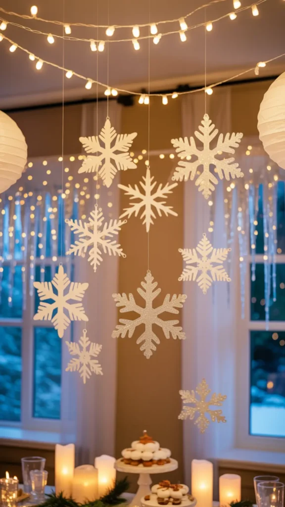 Hanging Decorations: Snowflakes, Icicles, and Ceiling “Snowfall”