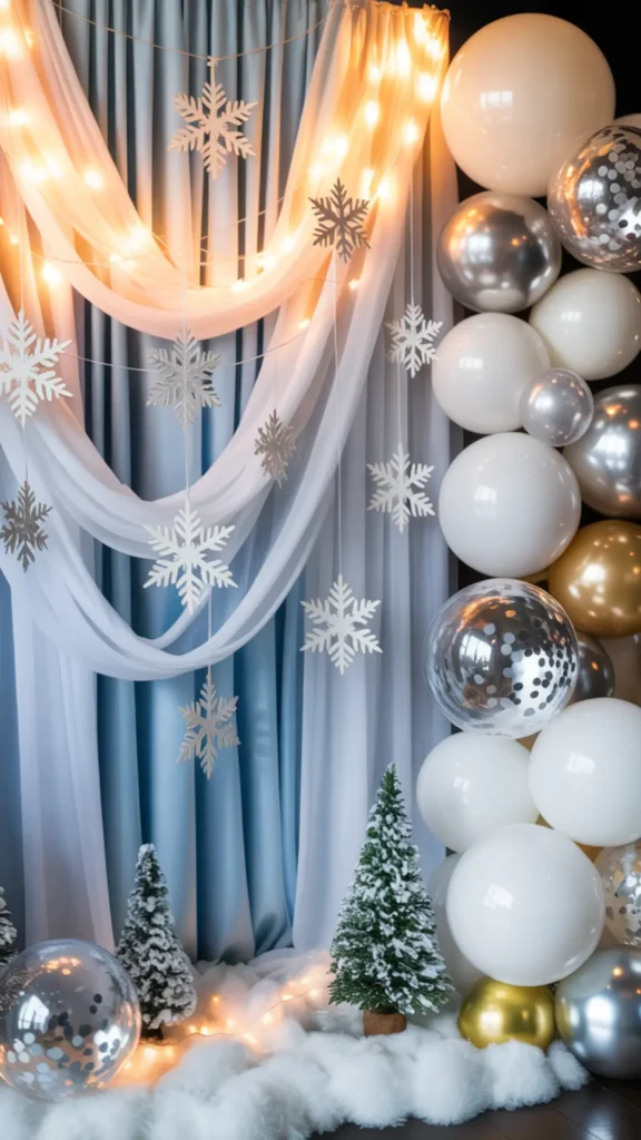 One of the best winter wonderland backdrops is a layered fabric wall. Start with a white or icy-blue curtain. Add sheer chiffon drapes for softness and movement. Behind the fabric, hang warm fairy lights so the whole wall glows. Add hanging snowflakes at different heights to create depth. This look feels romantic, magical, and expensive—especially in photos. If you want extra glam, use a silver sequin curtain instead of chiffon and add crystal bead strands for icy sparkle.