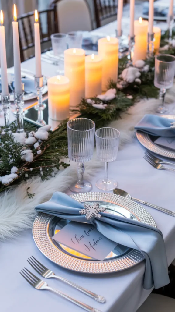 Next, add reflective pieces because winter wonderland is all about light bouncing around the room. Mirror trays under centerpieces, silver charger plates, clear glassware, and crystal-style candleholders make the table sparkle without messy glitter. Keep place settings simple but intentional: white/silver/ice-blue napkins, plus a snowflake napkin ring or a velvet ribbon tie. For name cards, use white cardstock with silver ink or acrylic cards for a modern frosted look.