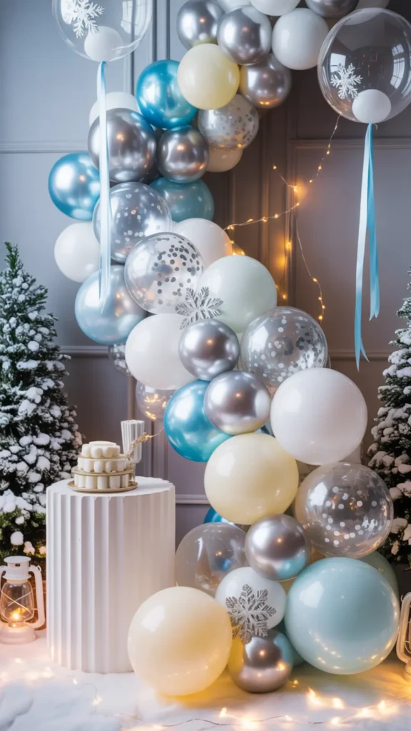 Balloons can look very elegant in a winter wonderland theme if you choose the right colors and finishes. Avoid bright colors and stick to whites, pearl whites, silvers, clear balloons, and soft icy blues. Clear balloons with silver confetti look like floating ice crystals, while pearl balloons look expensive and smooth. Mixing balloon sizes is what makes a garland look professional—use small, medium, and large balloons for depth and texture.