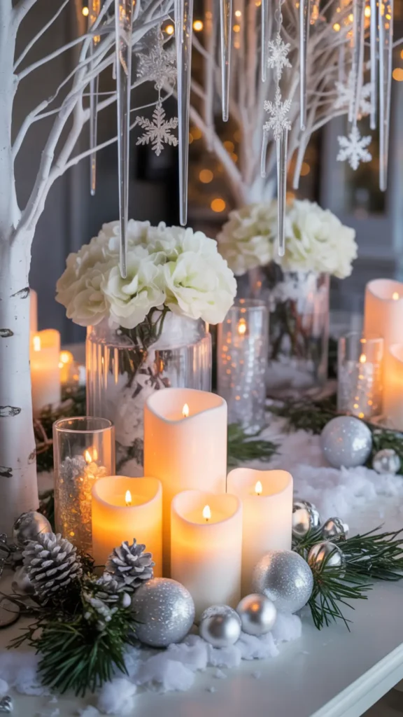 Centerpieces are the heart of winter wonderland party decorations because they create a “frosted forest” feel on the table. The best centerpieces for this theme use glow, different heights, and reflective texture. A simple centerpiece formula that works every time is: candles + frosted detail + one statement piece. Candles bring warmth, frosted details bring winter, and the statement piece adds style.