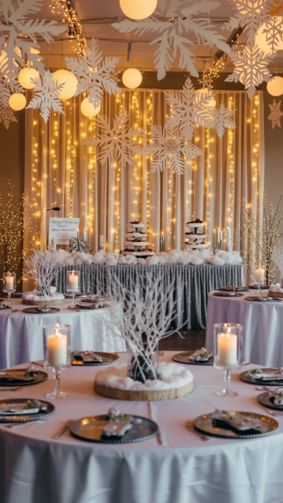 Ceiling décor is where winter wonderland becomes fully immersive. When guests look up and see snowflakes floating above them, the space instantly feels like a fantasy. Use hanging snowflakes in different sizes, and hang them at different heights so it looks like snowfall. Mix paper snowflakes, acrylic snowflakes, and glitter snowflakes (glitter sealed, not shedding) for different textures. Use fishing line or clear string so the snowflakes look like they’re floating.