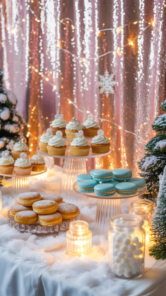 Decorate behind the dessert table using your backdrop: sequin curtain, lights, and hanging snowflakes. Add mini flocked trees on the sides and lanterns for glow. The dessert table should feel like a full photo scene because guests will take pictures there all night. When it’s styled well, the dessert table becomes both décor and entertainment.