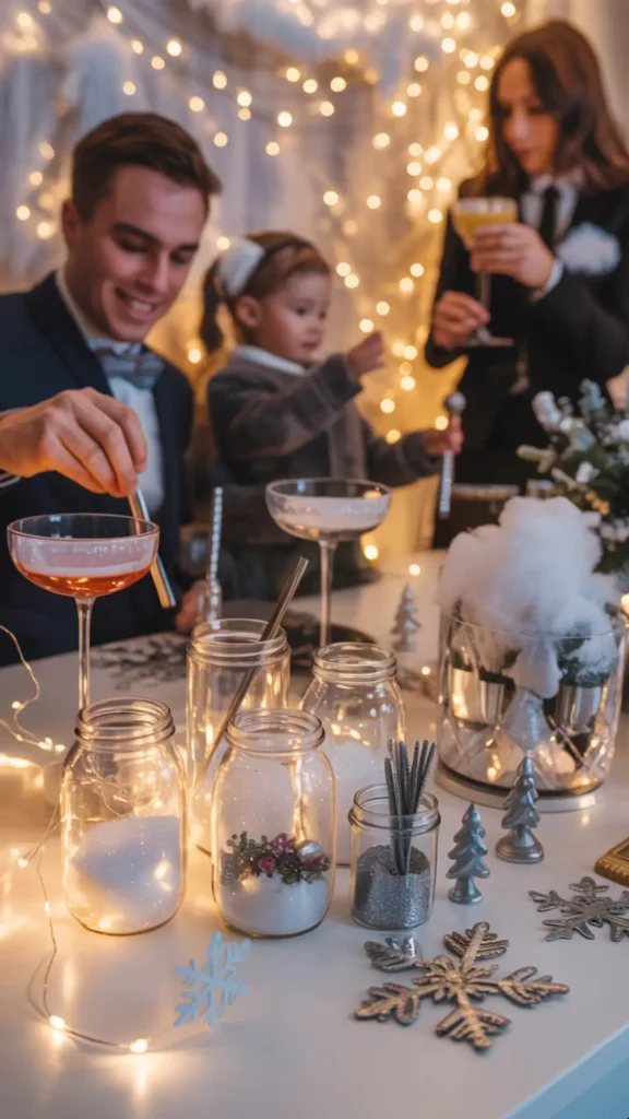 Activities make your winter wonderland party more than just pretty—they make it fun and memorable. For kids, a DIY snow globe station is perfect. Set out small jars, faux snow, mini figurines, and glitter (sealed inside). For adults, a winter cocktail bar or mocktail station can be a fun interactive idea. Serve sparkling drinks with sugar-rimmed glasses and silver stirrers for icy glam.