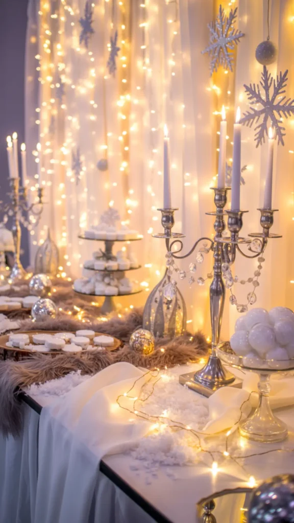 Icicle décor also adds drama, especially with lights. Hang icicle strands near the backdrop, above the dessert table, or along windows. If your venue allows it, add crystal bead garlands to copy the look of frozen droplets. They catch light beautifully, especially when candles and fairy lights are glowing nearby.