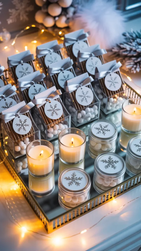 Party favors help the theme feel complete and make guests feel cared for. For winter wonderland, favors should feel cozy, snowy, and elegant. Good favor ideas include mini candles, hot cocoa packets, snowflake ornaments, lip balm sets, mini hand creams, or small jars of white candy. Even simple favors feel premium when you use clear boxes, silver ribbon, and a snowflake tag.